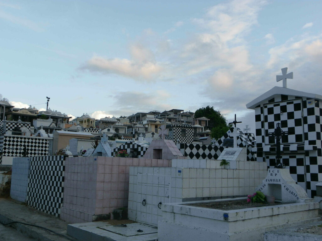 A 15 kilomètres de Pointe-à-Pitre, Morne-À-L’eau est un carrefour routier incontournable du nord de Grande-Terre. Mais la ville est surtout connue pour son cimetière, avec ses tombes ressemblant à de petites maisons aux motifs en damier blanc et noir tel un jeu d’échecs. Sur les quelque 1800 tombes que compte le cimetière, la plus ancienne remonte à 1847 et était vraisemblablement la tombe d’un béké, c’est-à-dire d’un créole de couleur blanche descendant des premiers colons. Seules les familles nobles pouvaient à cette époque y avoir une sépulture.